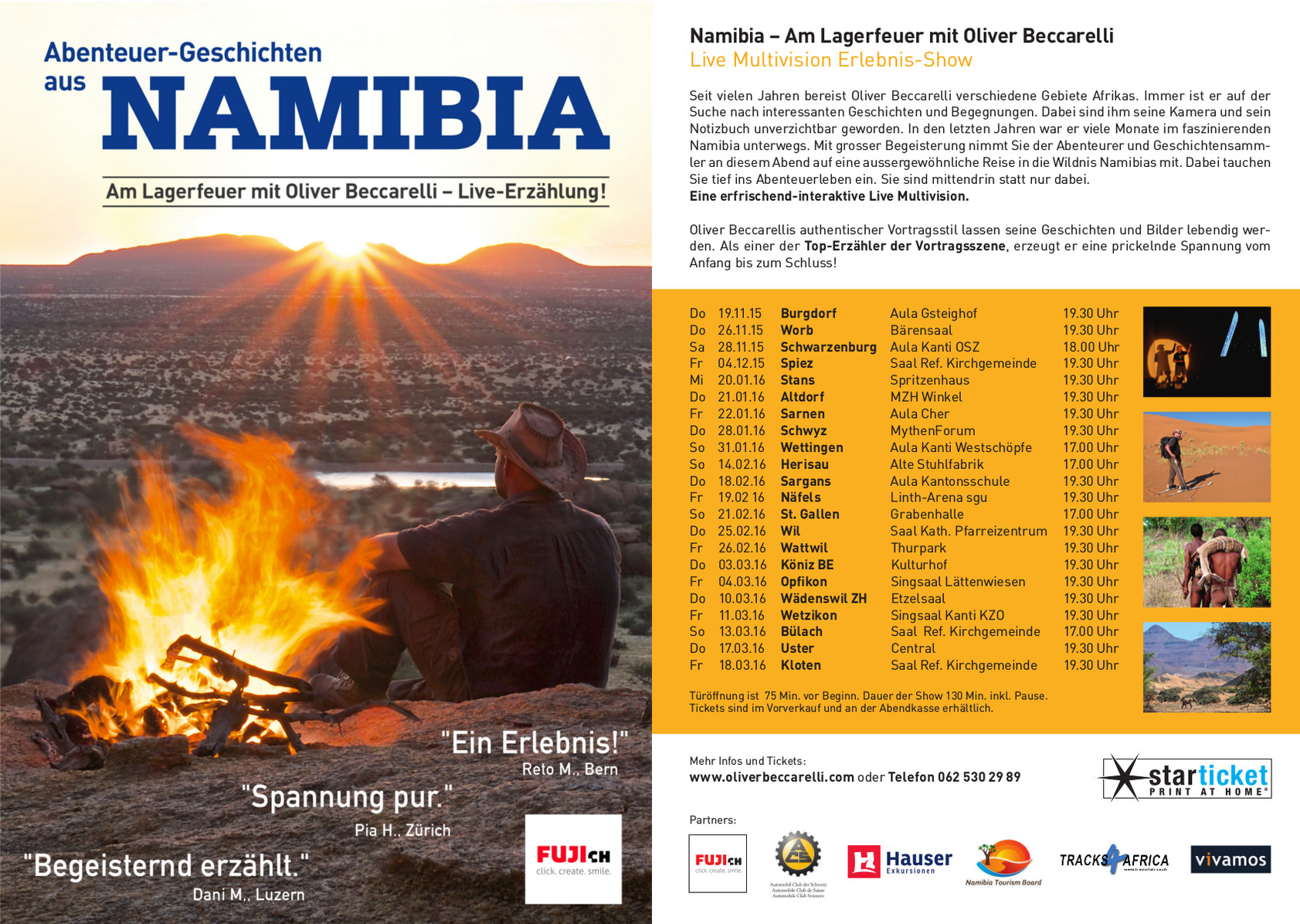 Seit vielen Jahren bereist Oliver Beccarelli verschiedene Gebiete Afrikas. Immer ist er auf der Suche nach interessanten Geschichten und Begegnungen. Dabei sind seine Kamera und sein Notizbuch unverzichtbar geworden. In den letzten Jahren war er viele Monate im faszinierenden Namibia unterwegs. Mit grosser Begeisterung nimmt Sie der Abenteurer und Geschichtensammler an diesem Abend auf eine aussergewöhnliche Reise in die Wildnis Namibias mit. Dabei tauche Sie ins Abenteuerleben ein . Sie sind mittendrin statt nur dabei.