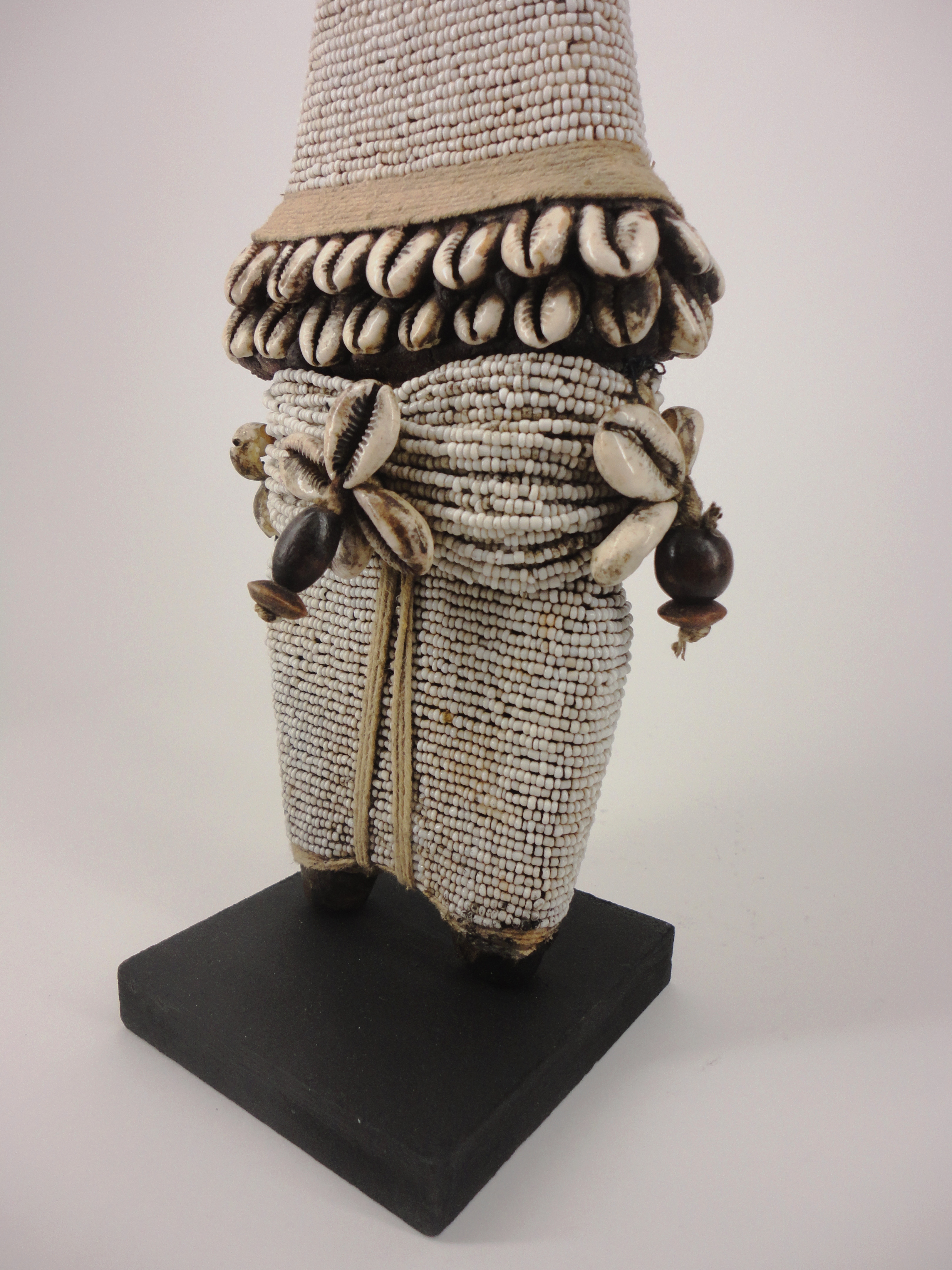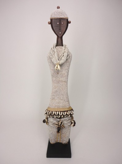 Das Namji Volk aus der Nordwest Region von Kamerun ist berühmt für seine Holzpuppen. Sie sind handgeschnitzt aus Edelholz, geschmückt mit zahlreichen bunten Perlen, verziert mit Kaurimuscheln als Bauch und Halsschmuck.