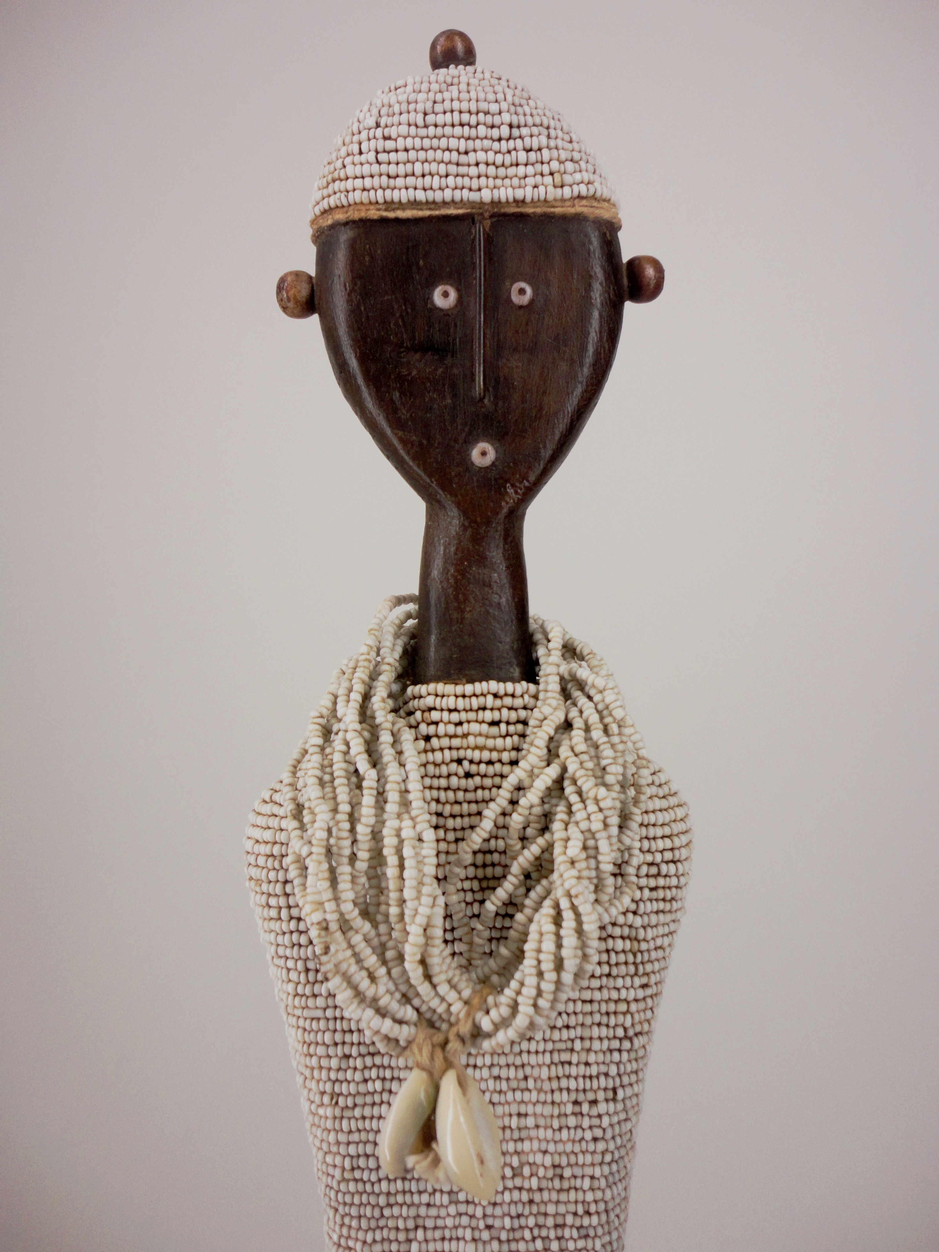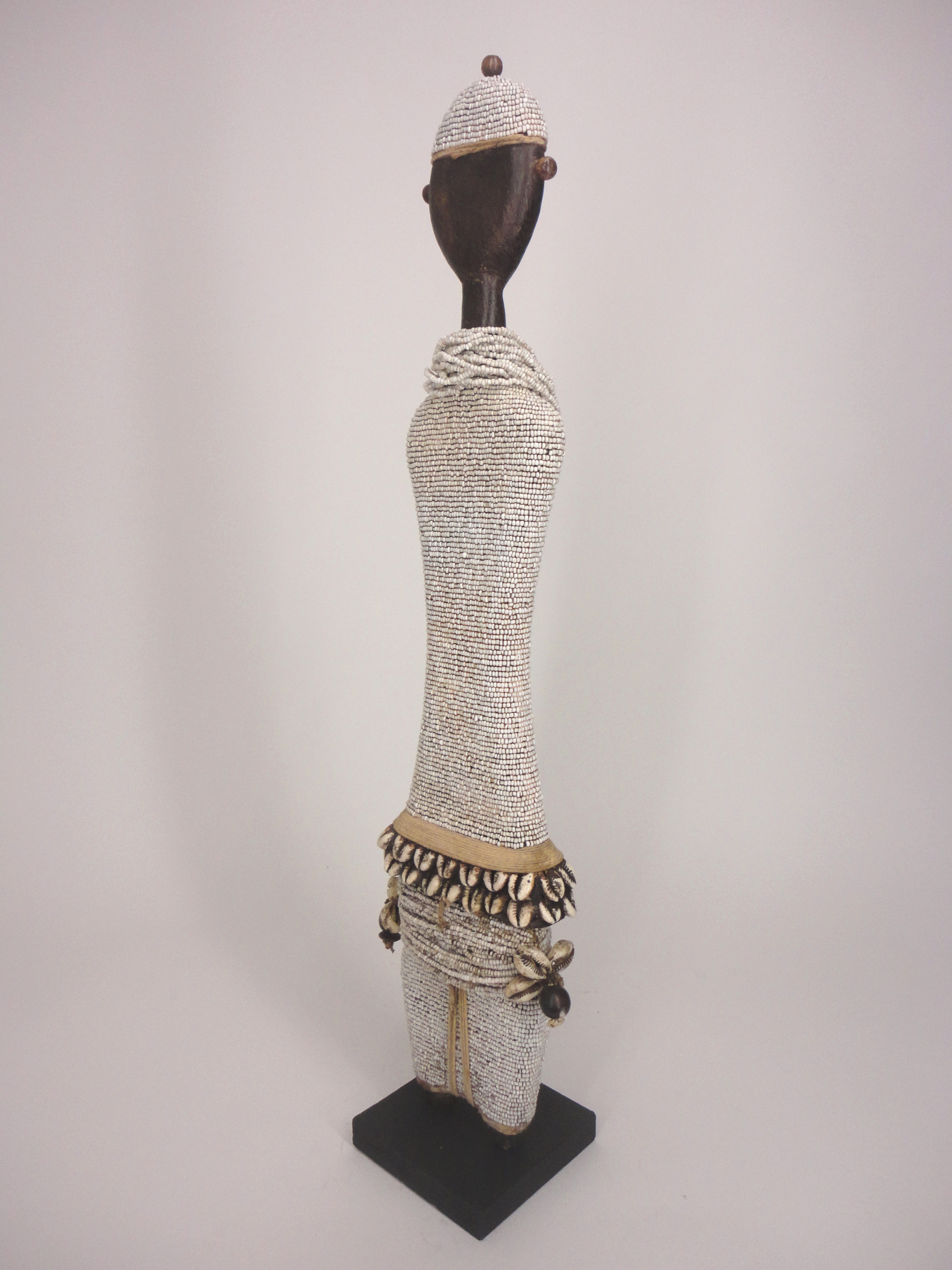 Dank der graziösen Gestalt und dem lieblichen Ausdruck, verleiht diese Perlen Puppe jedem Raum das unverwechselbare afrikanische Flair.