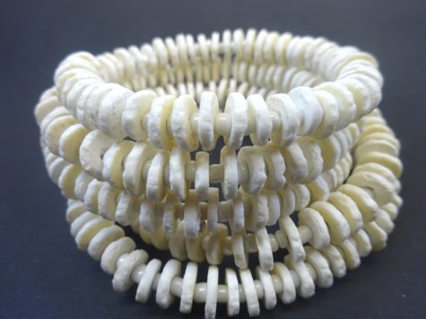 Wie archäologische Untersuchungen ergaben hat die Herstellung von Schmuck aus Strausseneierschalen bei den San (Buschmänner) eine über 40`000 Jahre alte Tradition. Noch heute werden die Schmuckstücke als Körperschmuck bei kulturellen Tänzen getragen, sind aber auch eine wichtige Einnahmequelle für die nomadisierenden Familien der Kalahari geworden.
