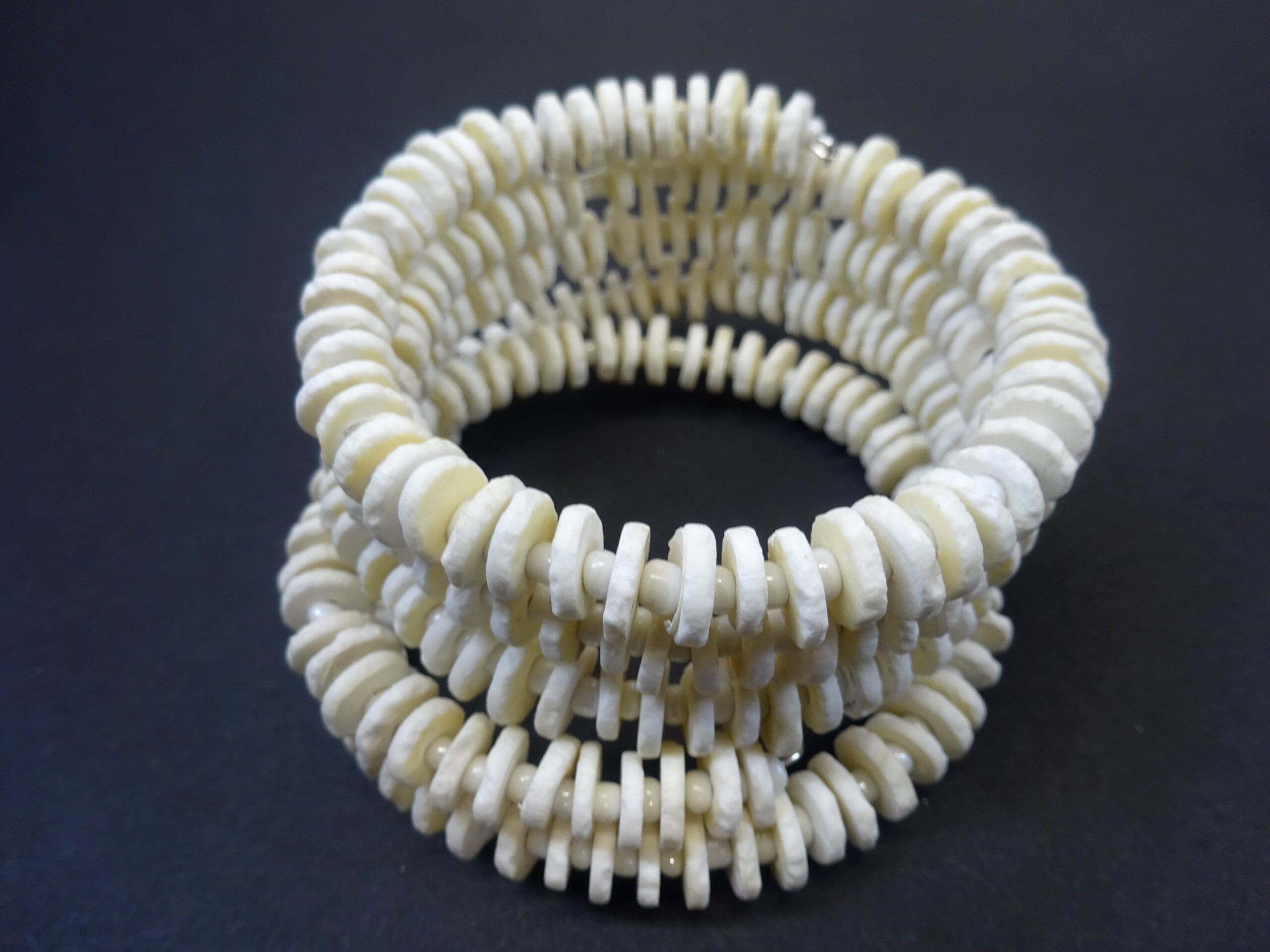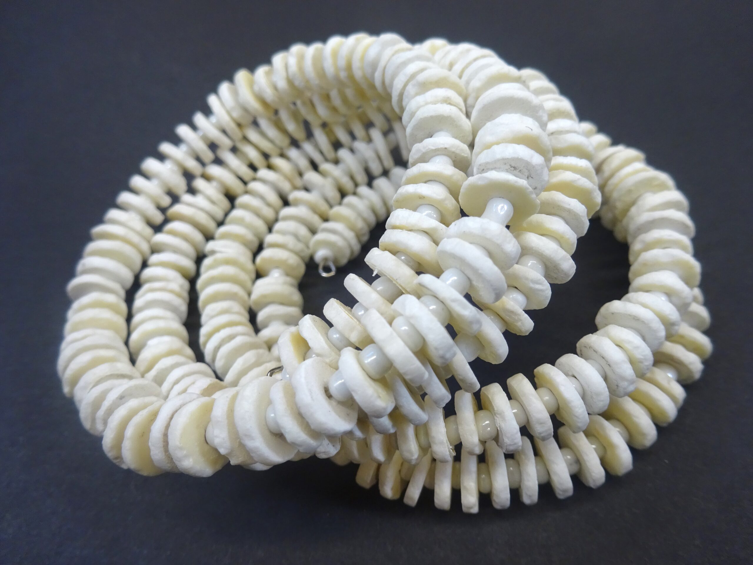 Wie archäologische Untersuchungen ergaben hat die Herstellung von Schmuck aus Strausseneierschalen bei den San (Buschmänner) eine über 40`000 Jahre alte Tradition. Noch heute werden die Schmuckstücke als Körperschmuck bei kulturellen Tänzen getragen, sind aber auch eine wichtige Einnahmequelle für die nomadisierenden Familien der Kalahari geworden.