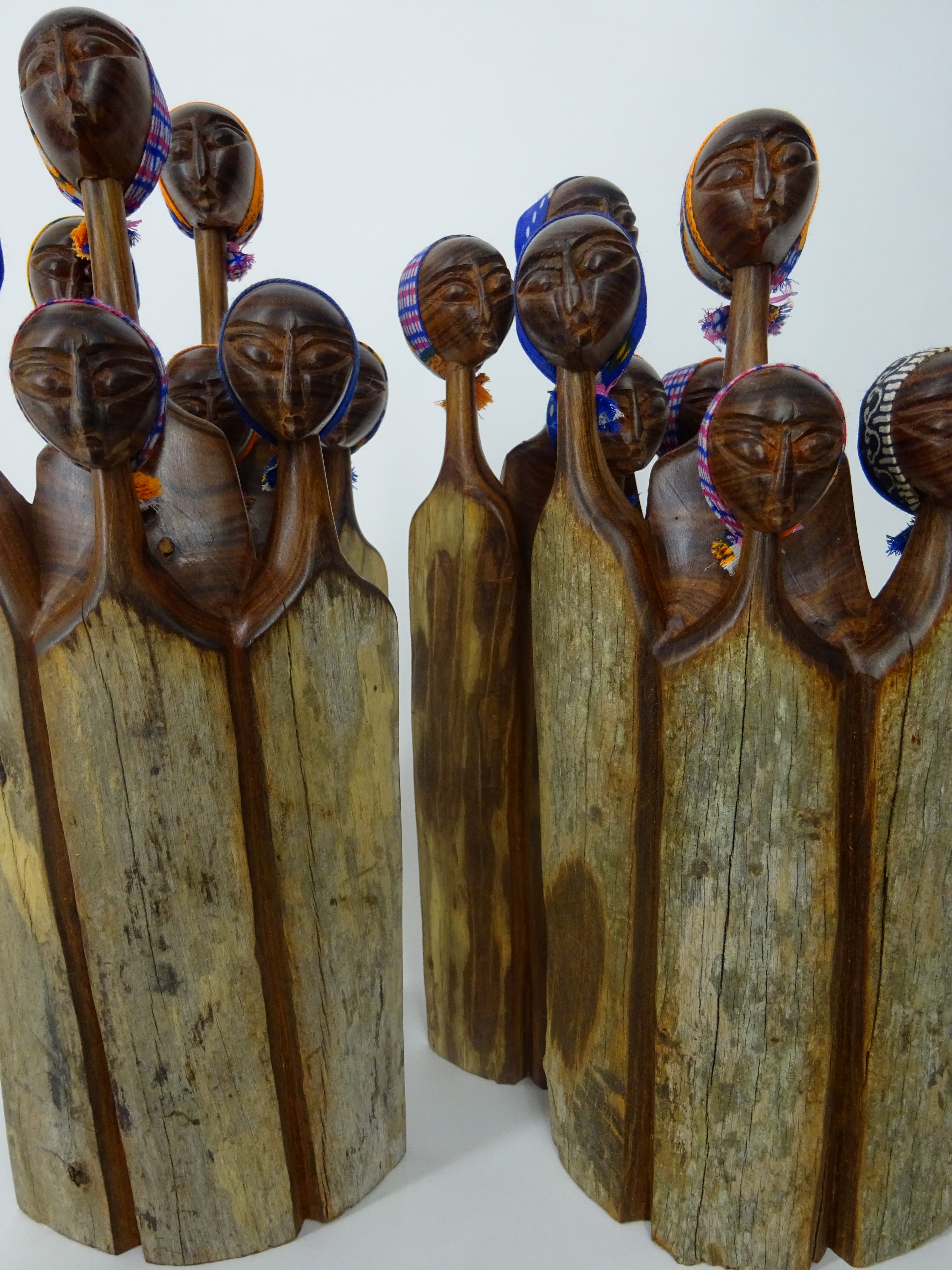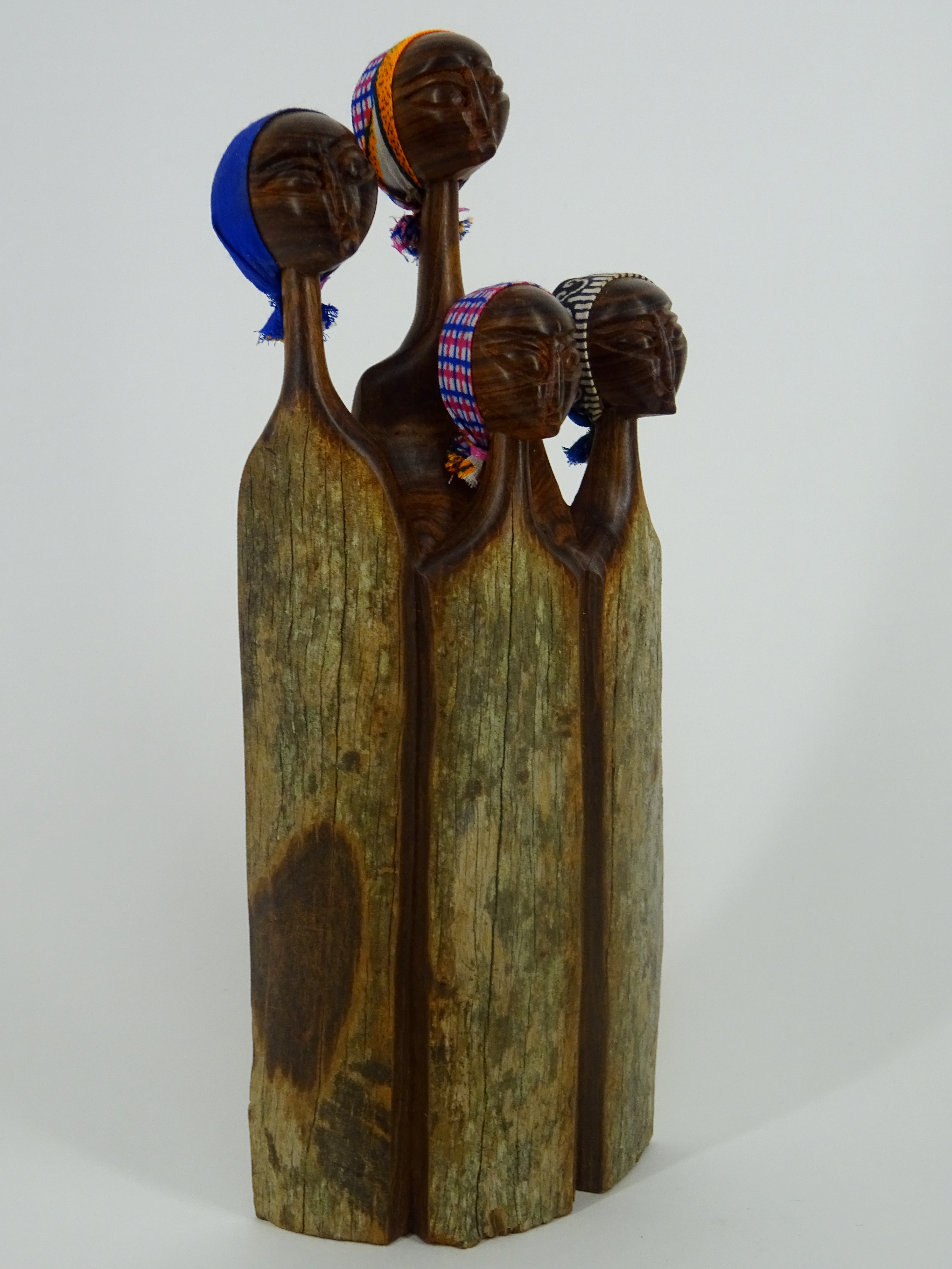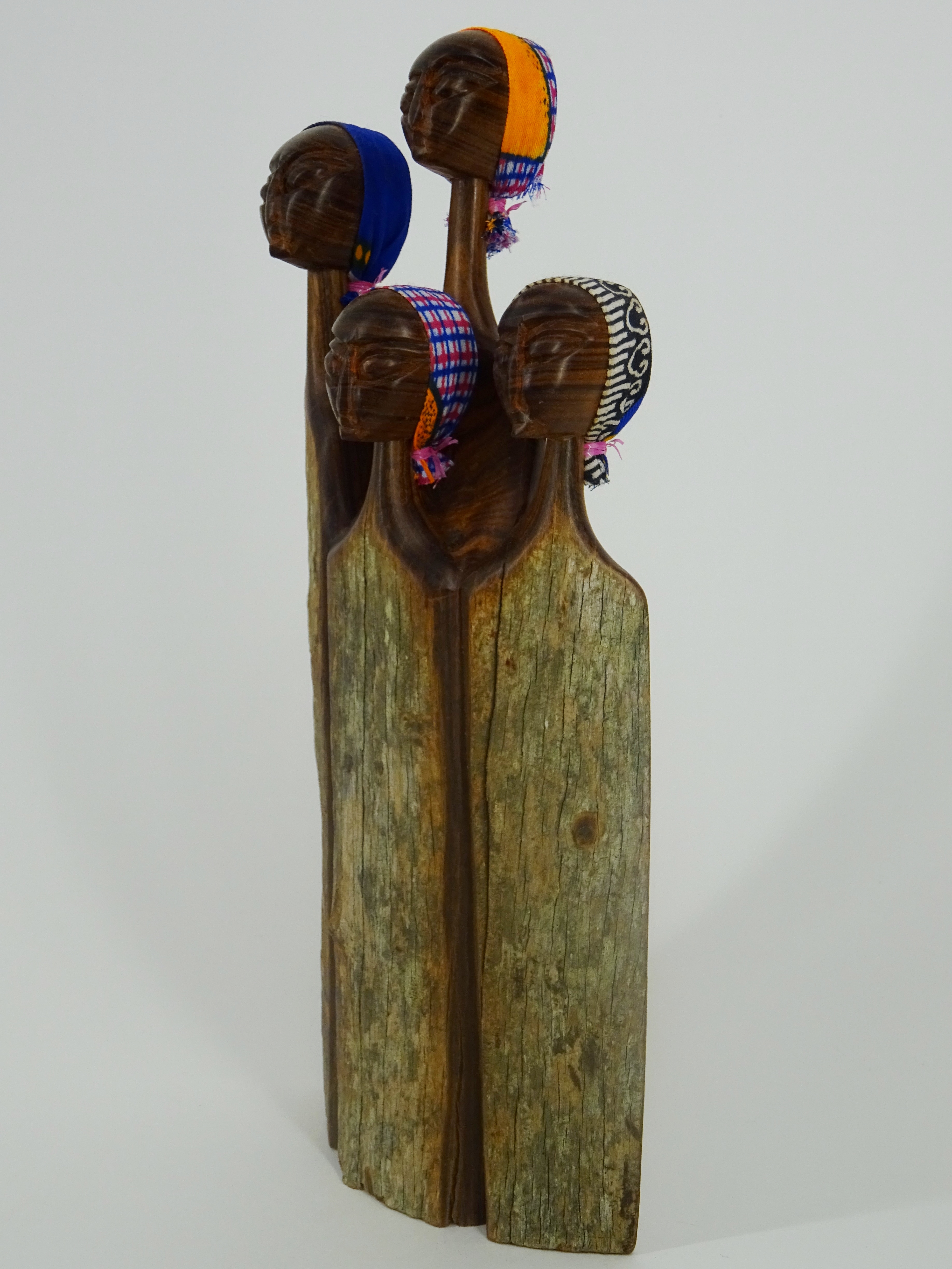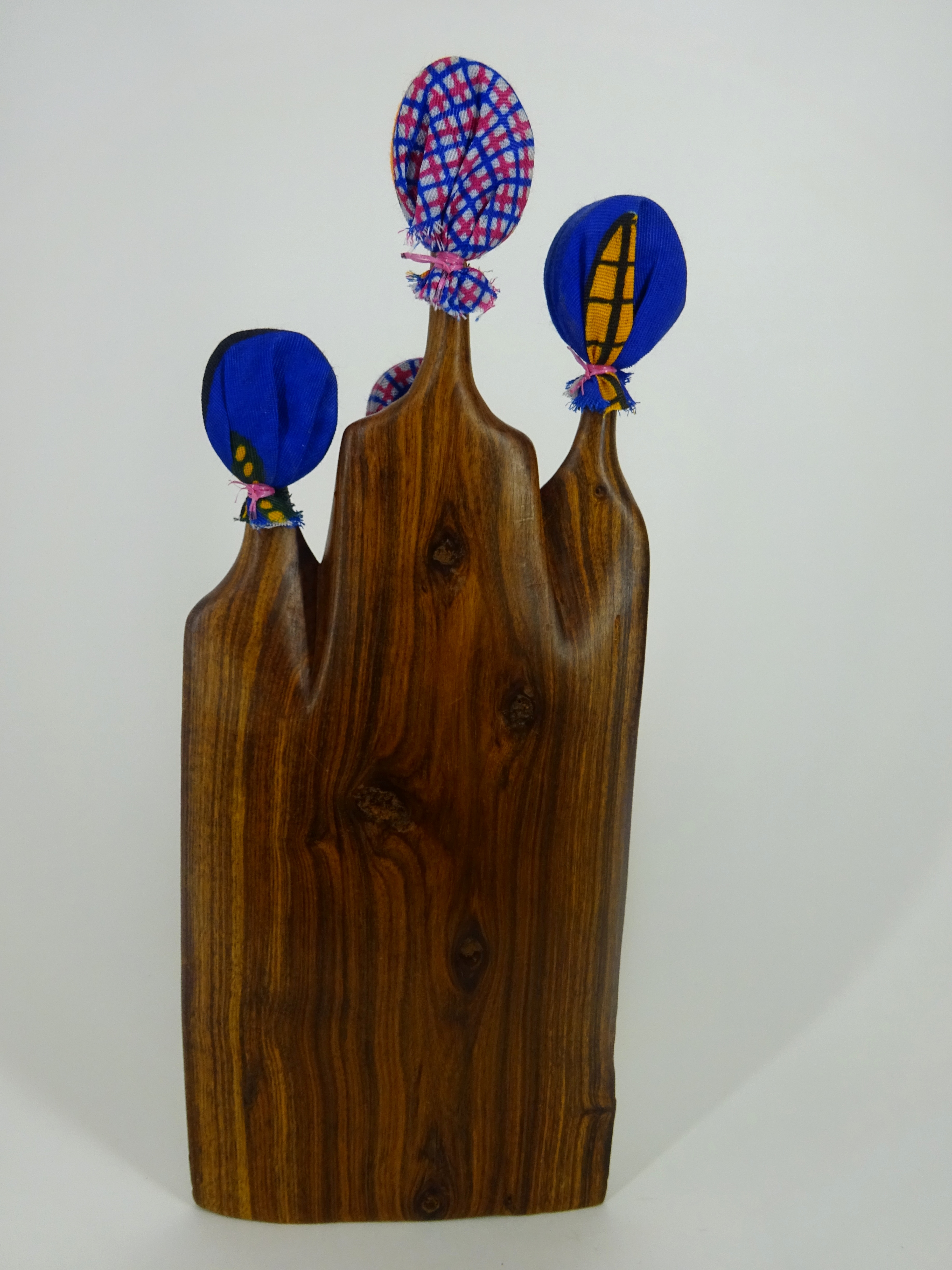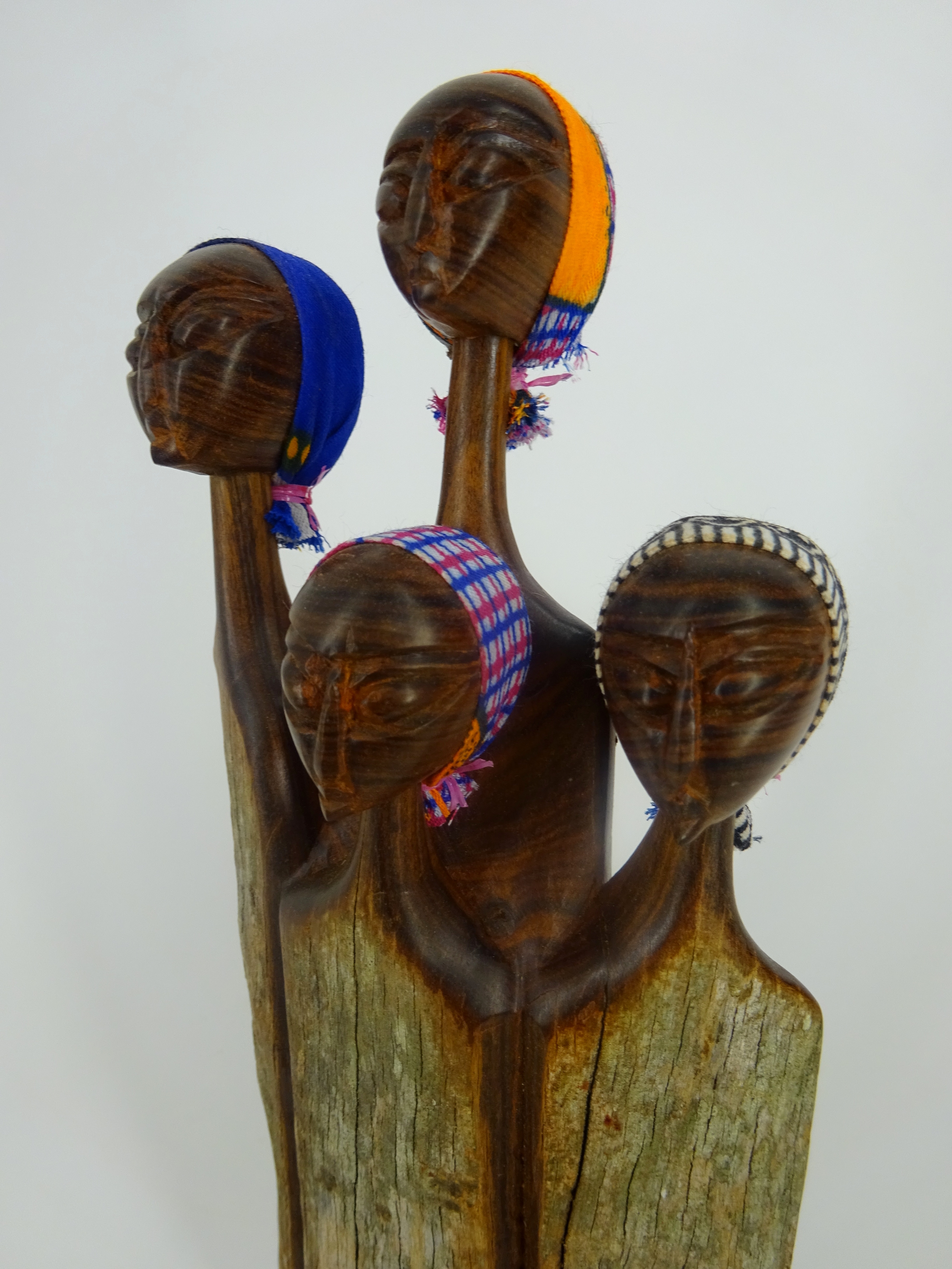 Sandelholz ist eine Holzart, die sich besonders durch seine Härte und seine Robustheit auszeichnet. Die kunstvollen Holzschnitzereien aus Sandelholz sind ein traditionelles Handwerk aus Mozambique. Die oberen Ränder der polierten Holzfläche sind teilweise farblich begrenzt. Die Vorderseite ist naturbelassen, die Rückseite poliert. Die Köpfe sind mit kleinen Kopftüchern aus Stoff versehen.